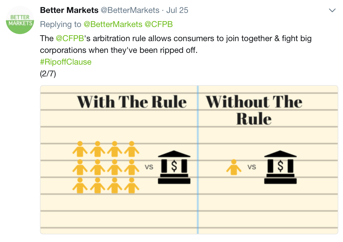 Fighting for consumers’ right to have their day in court and band together in a class action when they are ripped off, Better Markets took to social media to advocate for, and sharing information on, the Consumer Financial Protection Bureau’s (CFPB) newly created arbitration rule. Across our social media channels (with primary focus on Twitter), Better Markets focused on what the rule is, why the rule is needed (with real world & recent examples) and why the rule is good for consumers.