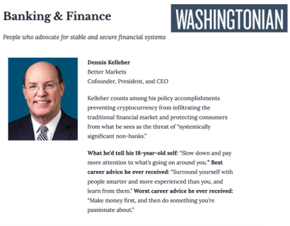 For the fifth year in a row, Washingtonian Magazine selected Dennis Kelleher, Co-Founder, President and CEO of Better Markets, as one of the Most Influential People in Washington. “With a new administration now in place, these power players’ expertise and strategic insight are especially crucial as they navigate shifting priorities and relationships across the capital,” Washingtonian says of the honorees.